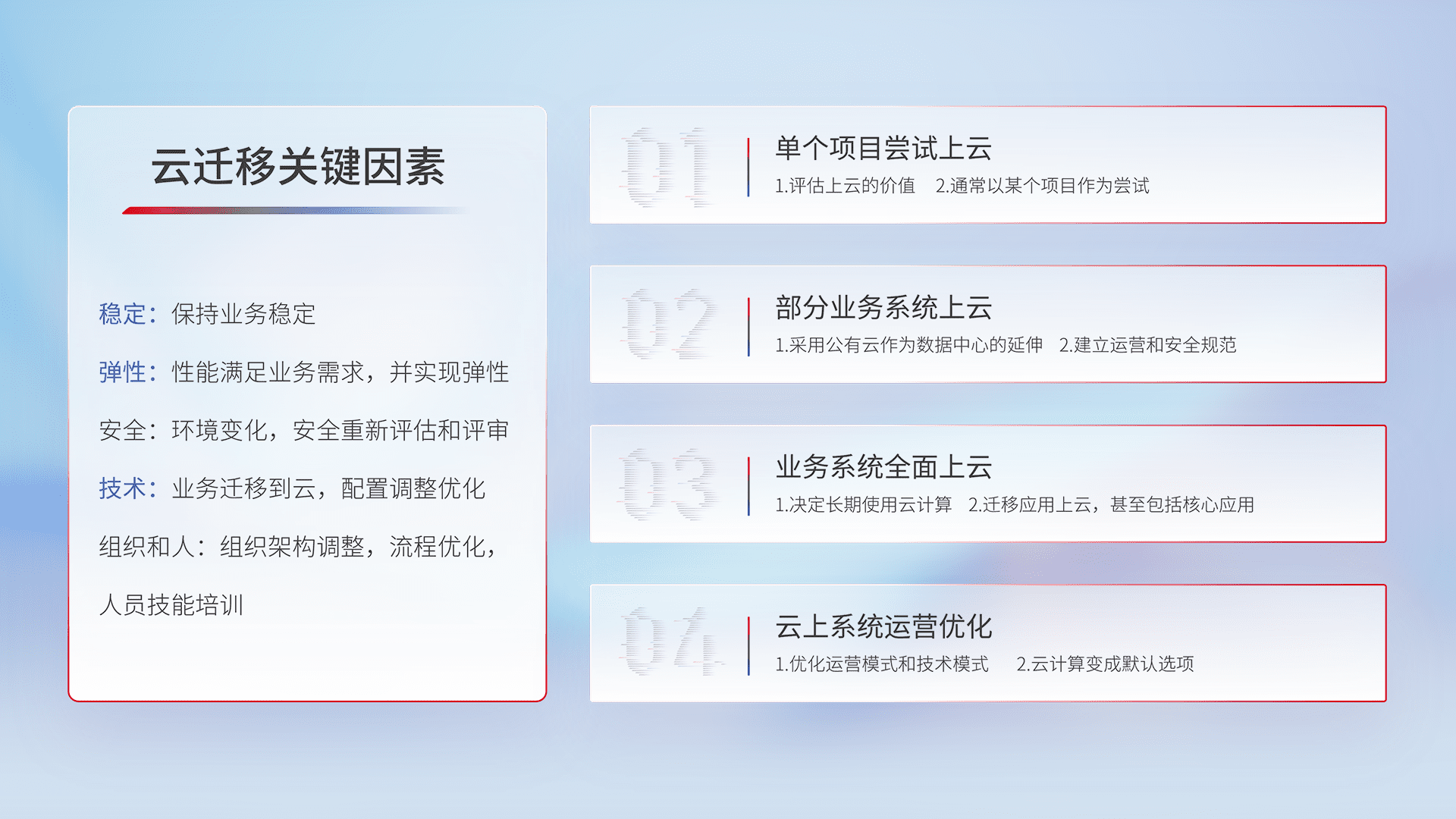 结合实际业务,,从规划设计、、云平台选型、、、、云原生改造、、、数据迁移、、、、集成交付,,,,迁移全过程为客户识别最佳上云路径,,做好风险识别管理,,,设计网络架构、、身份权限、、、安全审计合规、、、操作审计、、、日志审计、、监控告警策略、、多站点容灾设计等,,,,对云上基础设施进行整体规划,,提升IT治理水平,,以满足弹性、、、高可用、、高性能的需求。。。。